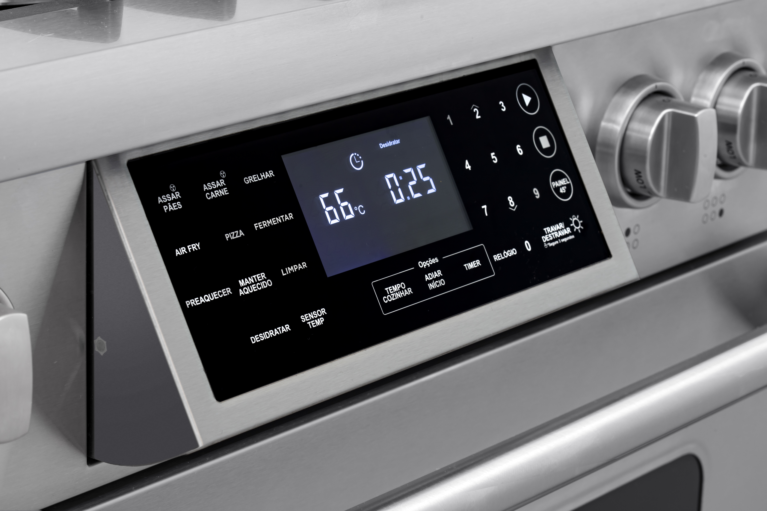 O painel de controle do forno, que abre a 45°, oferece uma navegação ergonômica e fácil acesso às funções. A função adiar início permite programar o início do cozimento conforme sua conveniência. Em caso de apagamento dos queimadores, o sistema de reacendimento automático garante operação contínua e segura.